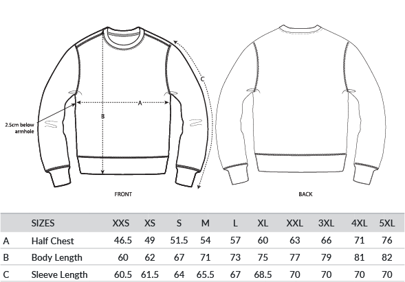 Set-in sleeve. 1x1 rib at neck collar, sleeve hem and bottom hem. Inside herringbone back neck tape. Flatlock topstitch on all seams. Self-fabric half moon at back neck. Oeko-Tex certified. Fair Wear certified.