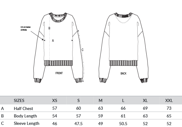 Set-in sleeves. Dropped shoulders. 1x1 ribs at collar, sleeve cuffs and bottom hem. Two-needle topstitches on all seams. Inside grosgrain back neck tape. Self-fabric half moon at back neck.
