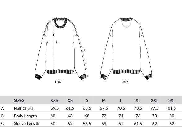 Set-in sleeves. 2x1 rib at collar, sleeve cuffs and bottom hem. Double-needle topstitches on all seams. Inside herringbone back neck tape. Self-fabric half moon at the back neck.